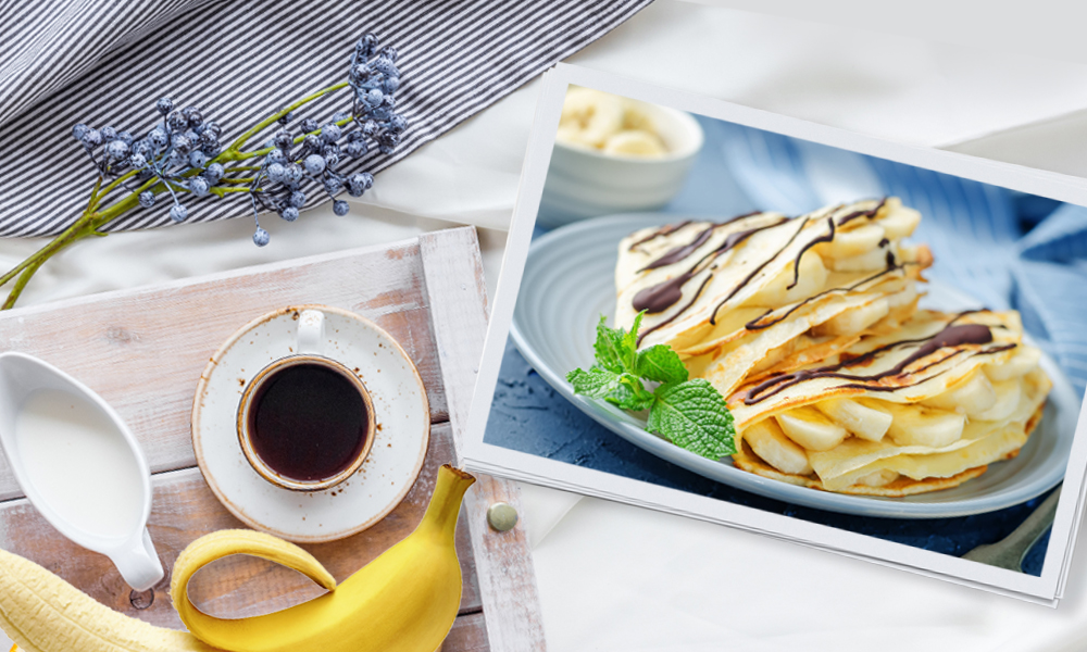 “法式薄饼柔软细棉,再加上香蕉与巧克力酱,甜品控们一定会喜欢!”