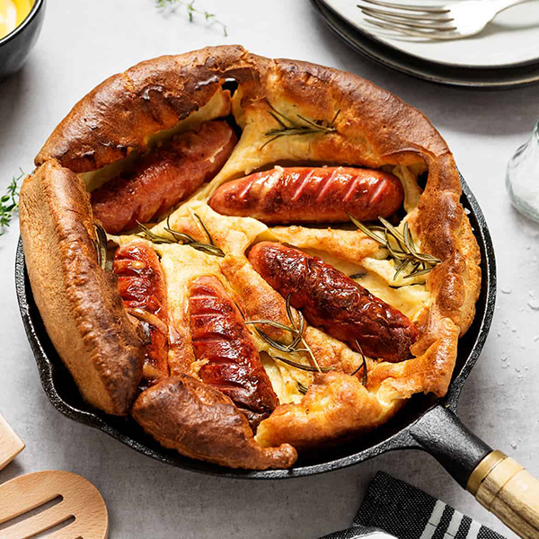 这道美味的菜肴英国人一般选择在家制作。做法和吃法都简洁明了,就是将香肠放入约克郡布丁面糊中烘烤,品尝方式也是与肉汁和蔬菜一起食用。没错,英国人都喜爱约克郡布丁,因此在英式传统菜肴中不难发现约克郡布丁的存在。