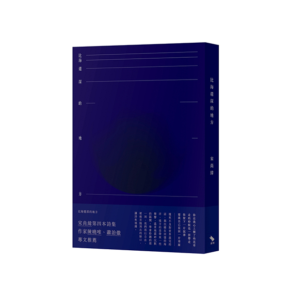 诗人宋尚纬的第四本诗集著作《比海还深的地方》收录了2015至2017年间创作的67首诗,全书分为两部分,辑一以内心情感为创作出发点,低语倾诉的温柔诗句与日常而生动的意象讲述人与人生命碰撞时所产生的情感,诸如爱恋、遗憾、寂寞等;辑二将近年来的社会议题融入诗作之中,直白而口语的诗句里蕴含浓烈的情感,如火山喷发前的能量蓄积,饱含着诗人对世界的关心与期许。
