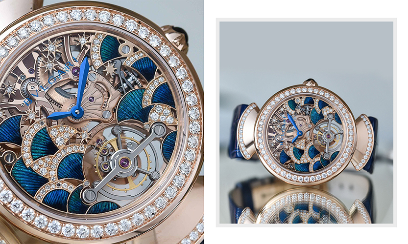 这款Divas’ Dream Peacock Tourbillon Lumière孔雀陀飞轮腕表,完美将意式美学设计与瑞士制表工艺结合。直径37毫米的玫瑰金表壳,镂空表盘饰以天然孔雀羽毛及雪花式密镶钻石,取法内填珐瑯勾勒出孔雀的轮廓,这也是传承数个世纪的顶级微型装饰工艺。表款搭载BVL 208手动上链机芯,陀飞轮装置在6点钟位置,表款共镶嵌165颗耀眼钻石,防水深度30米。限量发行10枚。