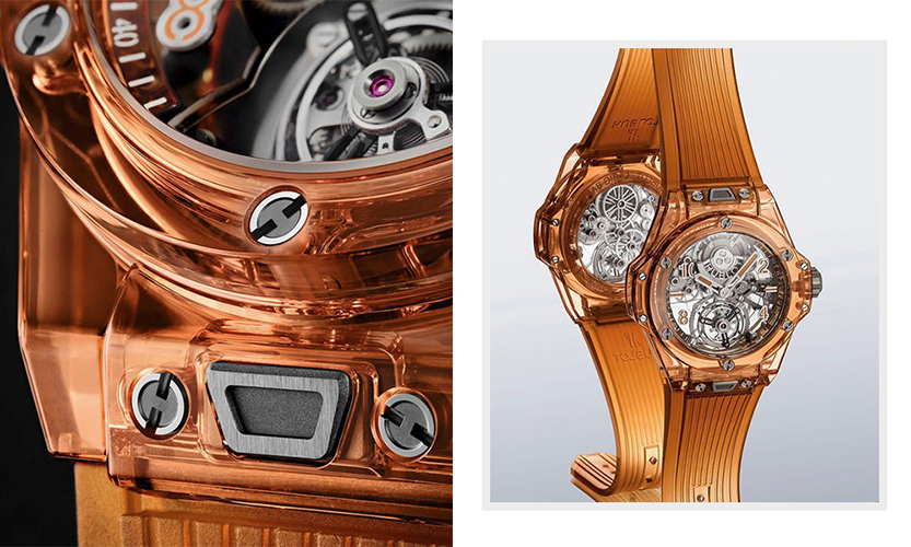 Hublot今年的重点新作聚焦在材质上,如同首度研发的冰橙色蓝宝石材质,并推出Big Bang Tourbillon Automatic Orange Sapphire首款采用橙色蓝宝石的表款,新色材质结合复杂功能,完美体现品牌“融合的艺术Art of Fusion”宗旨。直径45毫米表壳,搭载HUB6035陀飞轮自动上链机芯,动力储存72小时,12点钟位置的微型自动盘采用22K白金制成,陀飞轮则装置在6点钟位置,而指针及带有发光涂层的时标,让你在镂空表盘上更易读取时间。限量发行50枚。