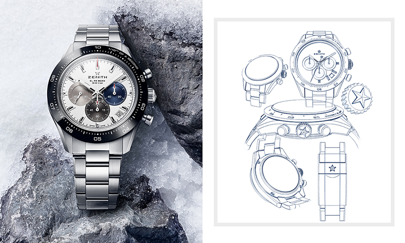 今年Zenith将重点放在Chronomaster Sport运动腕表上,延续Chronomaster系列的原创精神,其设计细节集合了多个品牌特色,像是三色计时表盘来自于1969年的型号A386腕表,表圈设计以Chronomaster De Luca为蓝本,以及1/10秒的表圈刻度设计,并直接镌刻于黑色陶瓷表圈上,每10秒将走完一圈。表款搭载全新的EI Primero 3600机芯,性能更卓越且走时更精准,动力储存延长至60小时,通过透明蓝宝石底盖,机芯的全新布局设计清晰可见,而蓝色导柱轮及装饰品牌五芒星的镂空摆陀,令人怦然心动。